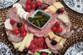 Home-made foie gras, dried duck breast, Pata Negra ham, smoked salmon, rosette, guacamole, local cheeses, seasonal fruit and vegetables.