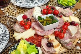 -Foie gras fabrication maison, magret de canard séché, jambon Pata Negra, saumon fumé, rosette, guacamole, fromages de notre région, fruits et légumes de saison.